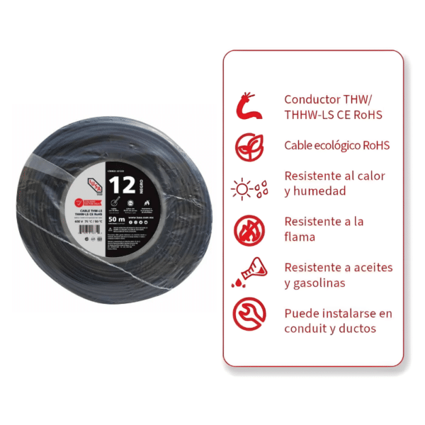 Cable THW-LS/THHW-LS CE RoHS Calibre 12 AWG Negro 50 Metros IUSA 267293