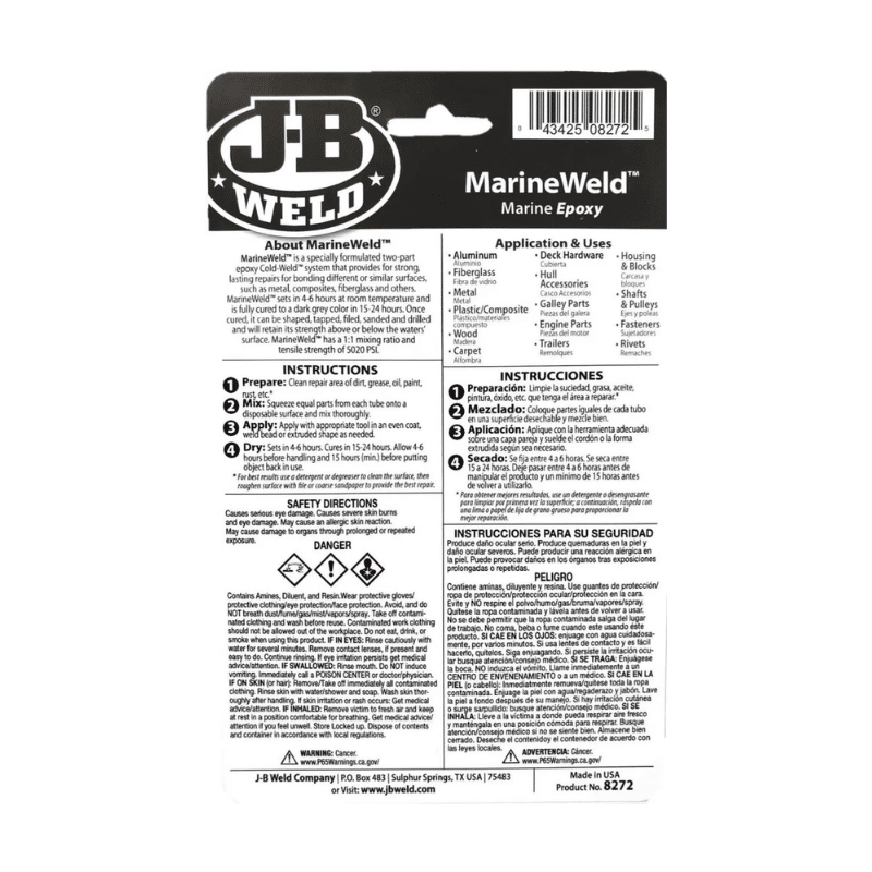 - MarineWeld ™ tiene una proporción de mezcla de 1: 1 y una resistencia a la tracción de 5020 PSI